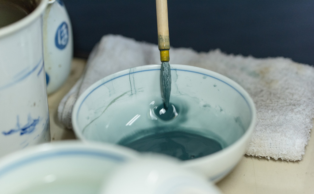 mg&gkの文様の絵付けは有田焼で最もよく使われる、呉須と呼ばれる青い顔料を使用しています。どんな食べ物にも合うように、そして優しい印象になるように、絵付けのみずみずしさの出る淡い色調にこだわって線を描いています。とても濃度の調整が難しい技術なので熟練の職人だけが成せる技です。一筆一筆、ゆったりした気持ちで使ってくださるお客様を想像しながら描いています。