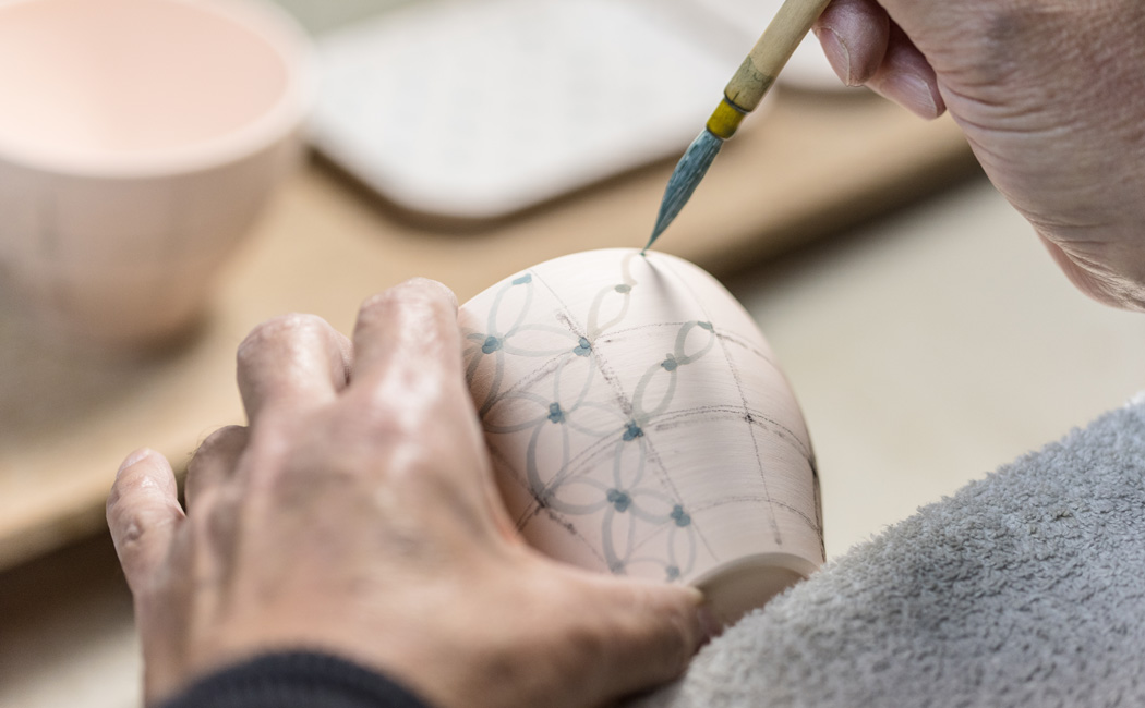 The motif of mg&gk is painted with the blue pigment called gosu, which is most often used in Arita-yaki. We take great care of each brush stroke using light shades that bring liveliness of the pattern, create soft impressions, and go well with any kind of food. This requires a complex shades adjustment technique that only veteran craftsmen can handle. They apply each brush stroke imagining our customers who use our products in their relaxing moments.