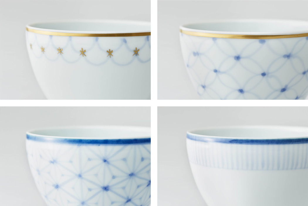 高い焼成温度で焼き締められた有田焼の薄く滑らかな白い磁肌に、「波」「七宝」「麻の葉」といった縁起の良い吉祥文様をベースとした絵付けが、寛ぎのひと時を優しく演出します。