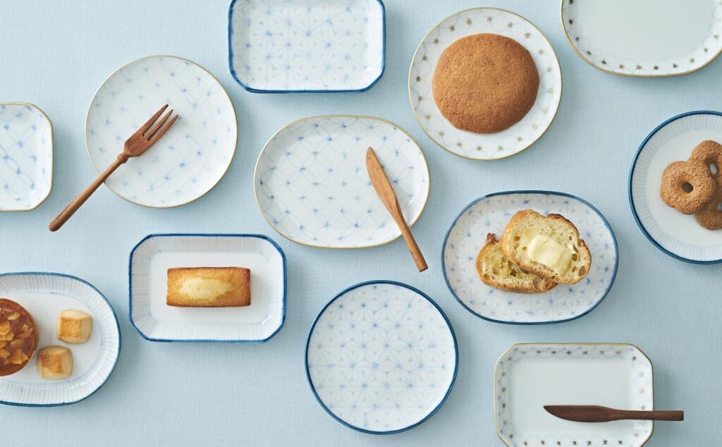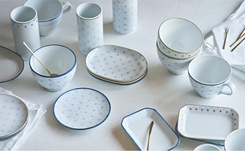 Silky Arita-yaki porcelain with auspicious motifs, such as nami (wave), shippo (seven treasures), and asanoha (hemp leaves), contributes to your graceful time.